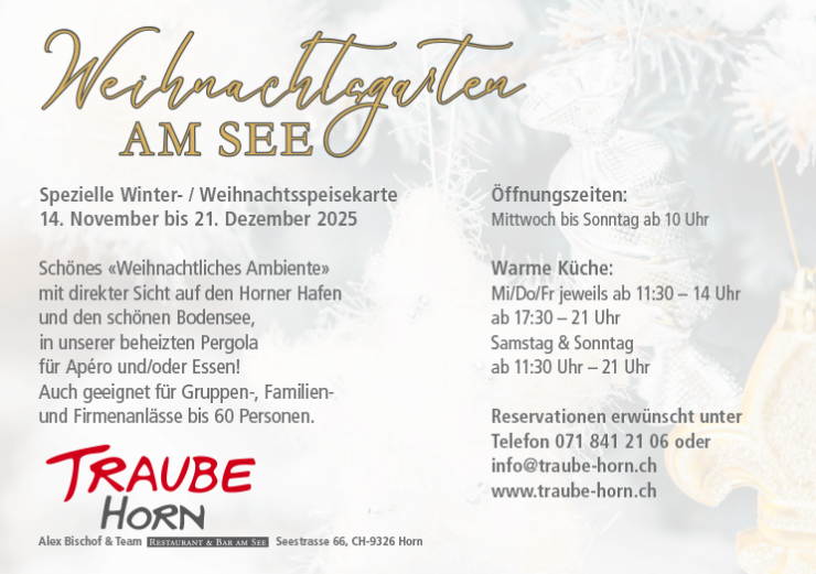 Wir freuen uns, Sie in der Traube Horn begrüssen zu dürfen. Es erwartet Sie ein aufgestelltes Team in einer einladenden Umgebung direkt am Horner Hafen.
